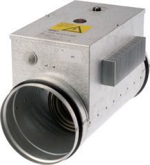 Kör keresztmetszetű elektromos fűtő kalorifer beépített pulzerrel (arányos szabályzás). A kívánt hőmérséklet a kaloriferre szerelt potenciométeren állítható be. A maximális kilépő hőmérséklet. 50 °C. A kívánt minimális légsebesség a hőcserélőn 1.5 m/s. A beépítési méret NA 100 mm-től egészen NA 400 mm-ig, a teljesítmény tartomány pedig 300 W-tól 9000 W-ig terjed. Elektromos betáplálás: 230 vagy 400 V AC. A kívánt levegő hőmérséklet méréséhez egy külső TGK érzékelő beépítése szükséges. (Jelzések: 1F =1 fázis 230V // 2F =1 fázis 400 V // 3 F = 3 fázis 400V )